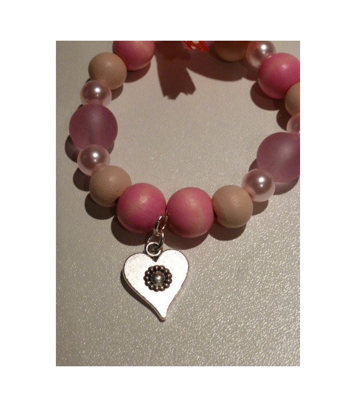 Roze houten kralen afgewisseld met pareltjes kralen en afgewerkt met een lief strikje en een hartje-bedeltje.
