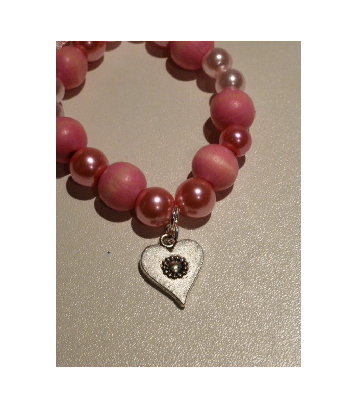 Lief roze armbandje met houten kralen, pareltjes en afgewerkt met een lintje en een hartje-bedeltje.