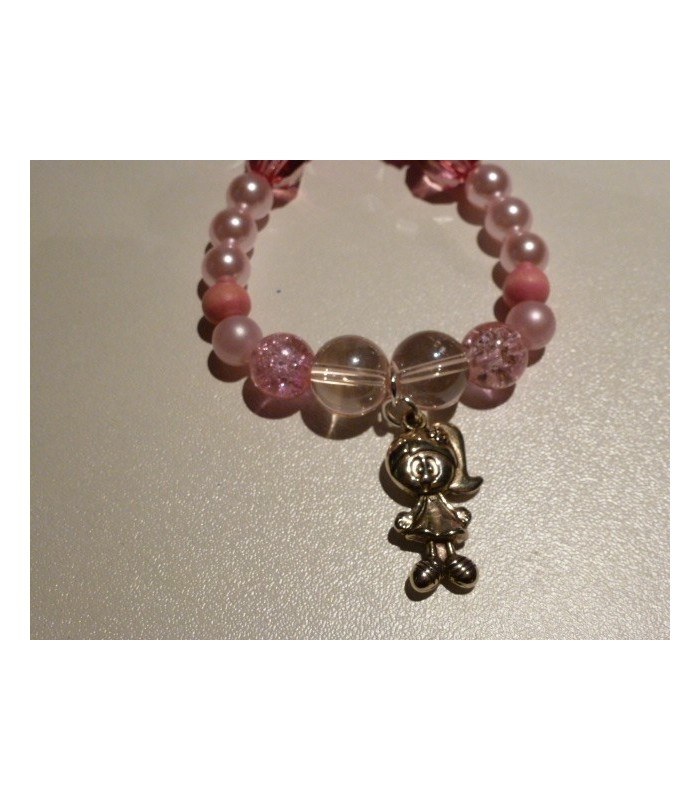 Lief meisjes armbandje met transparante kralen en pareltjes. Afgewerkt met een strikje en een meisjes bedeltje.