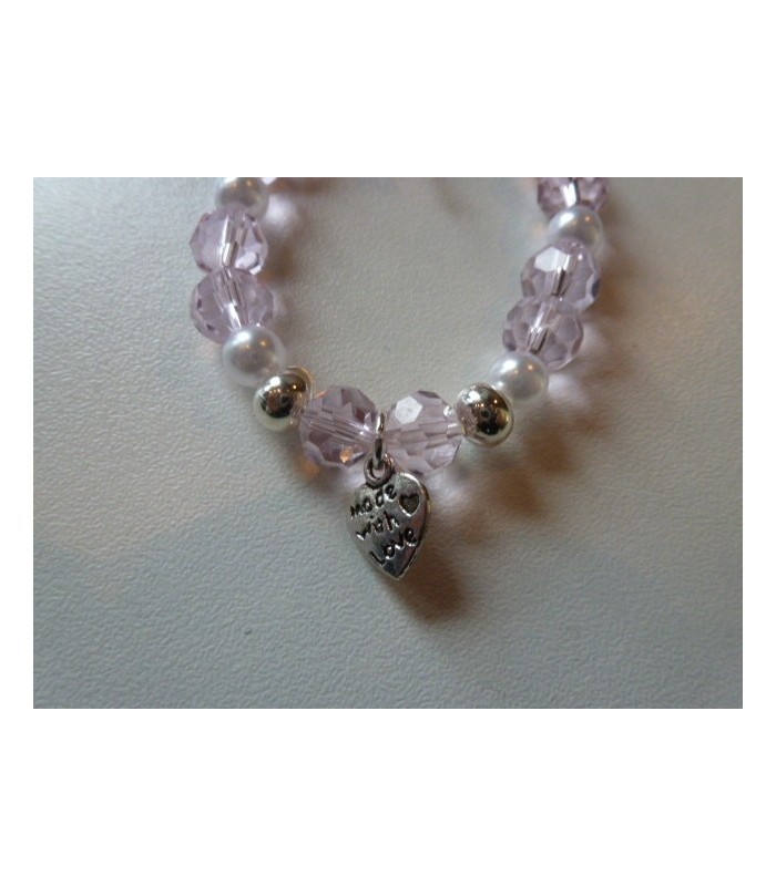Lieflijk armbandje met transparante kraaltjes, afgewerkt met een strikje en een metalen bedelhartje.
