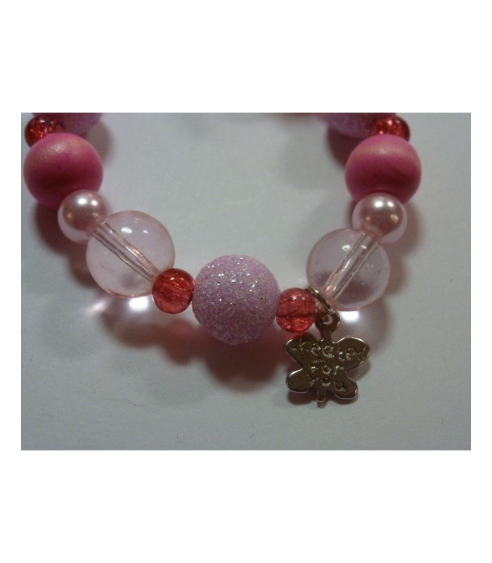 Transparante kralen afgewisseld met roze, pareltjes en rode kraaltjes. Afgewerkt met vlinder bedeltje.