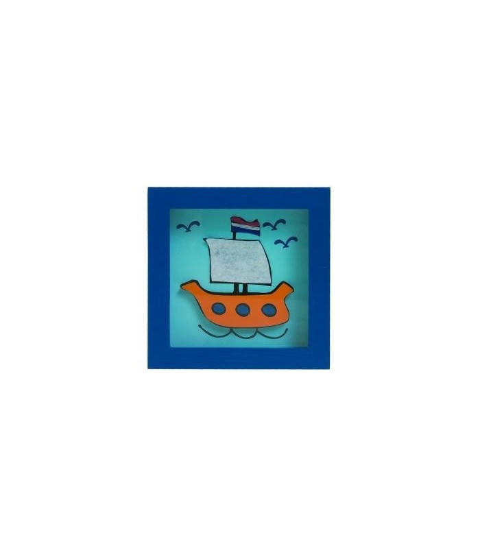 Schilderij Piratenbootje gemaakt van vilt met houten lijstje. afmeting 12x12cm