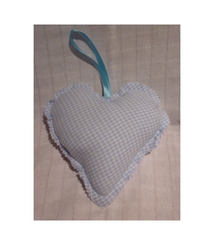 Hart van stof met fijn blauw ruit motiefje en ophanglusje. Afm. circa 20x18 cm.