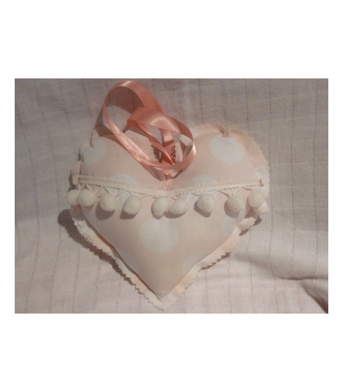 Hartje van lichtroze stippen stof met ophanglusje. afm. circa 20x18 cm.