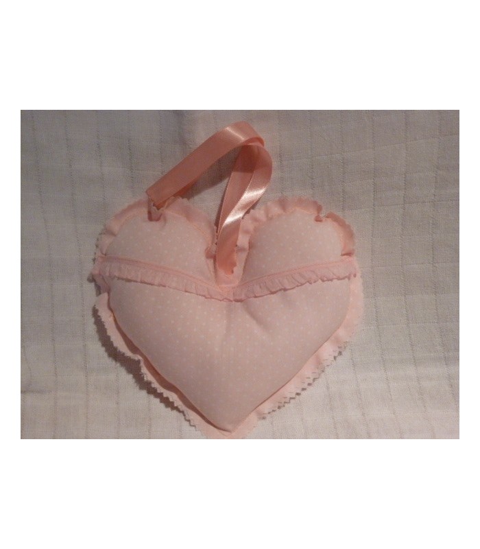Hartje van lichtroze met fijne stippen motief en ophanglusje. Afm. 20x18 cm.