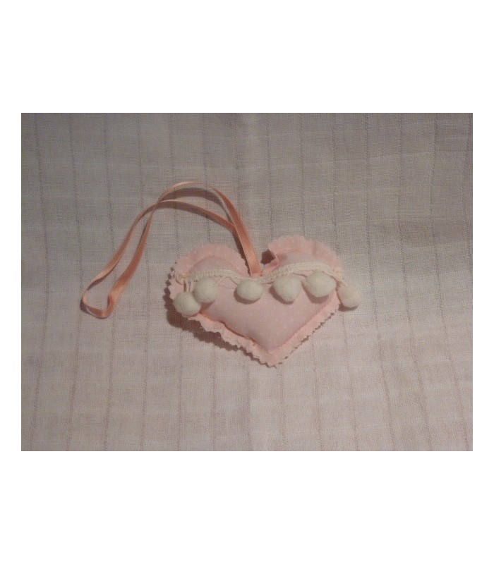 Klein hartje gemaakt van lichtroze stof met stipjes en ophanglusje. afm. ca 11x9cm.