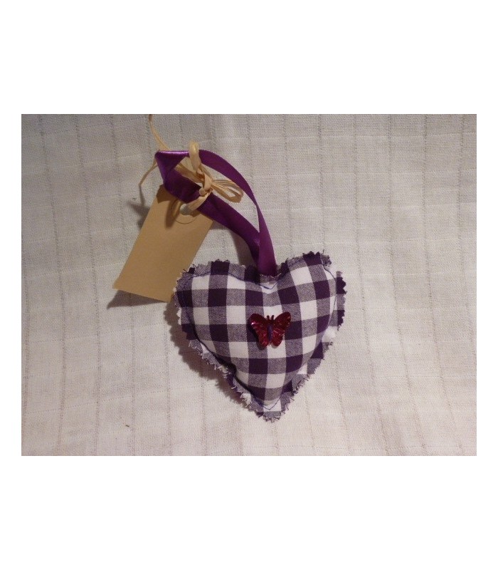 Hartje (klein) van grote ruitstof met een vlinder applicatie en ophanglusje. afm. 10x10cm.