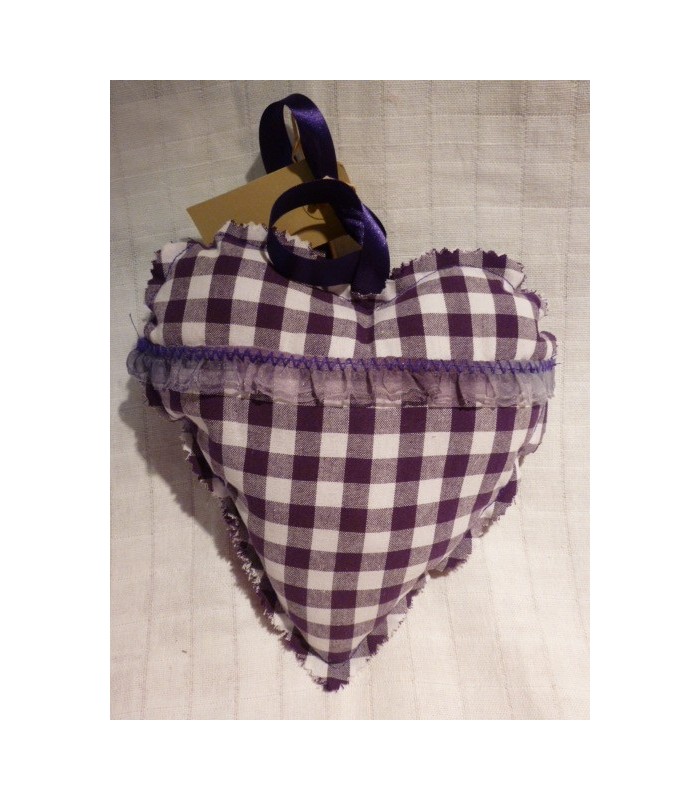 Hartje groot gemaakt van grote ruiten stof met ruche als extra en een ophanglusje. afm. ca 21x21 cm.