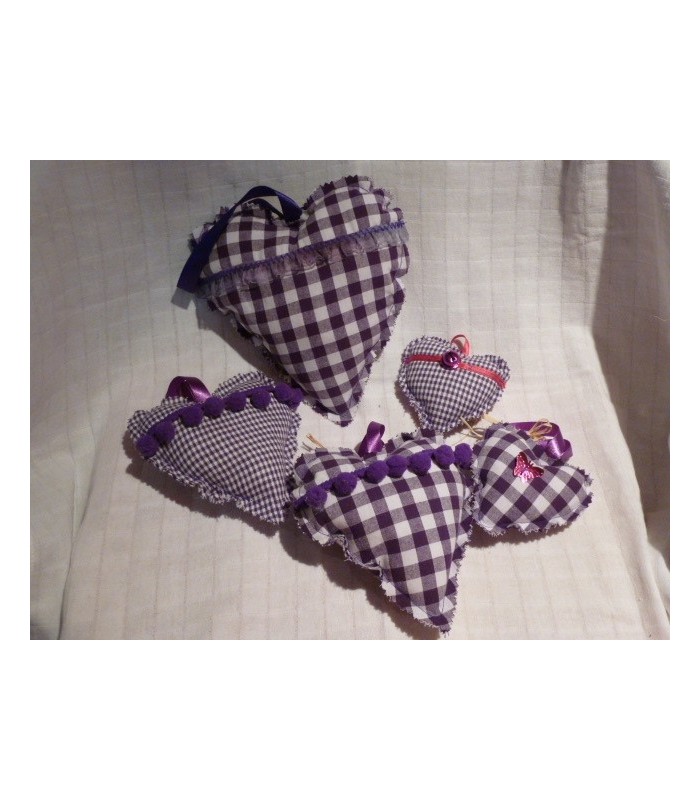 Hart gemaakt van grote ruitenstof met als extra een bolletjes-randje en een ophanglusje. Afm. ca 16x18 cm. leuk te combineren met de andere harten in het paars.